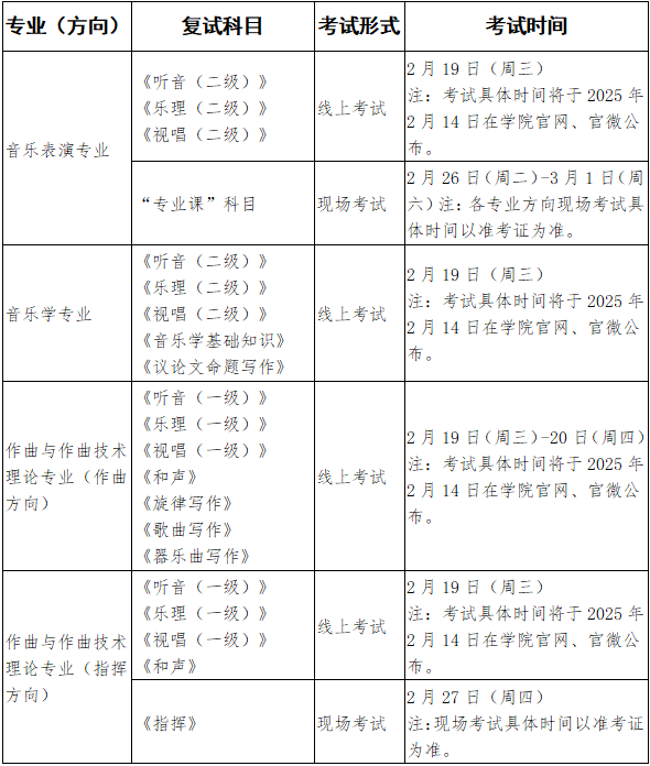 2.作曲与作曲技术理论专业作曲方向复试所有科目、作曲与作曲技术理论专业指挥方向除《指挥》科目现场复试外,线上笔试为2月19日(周三)-2月20日(周四)。