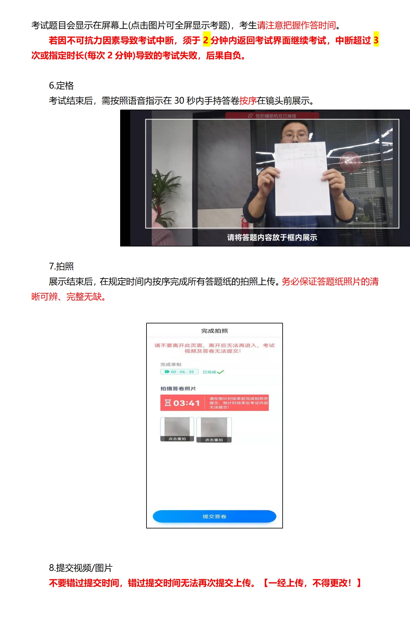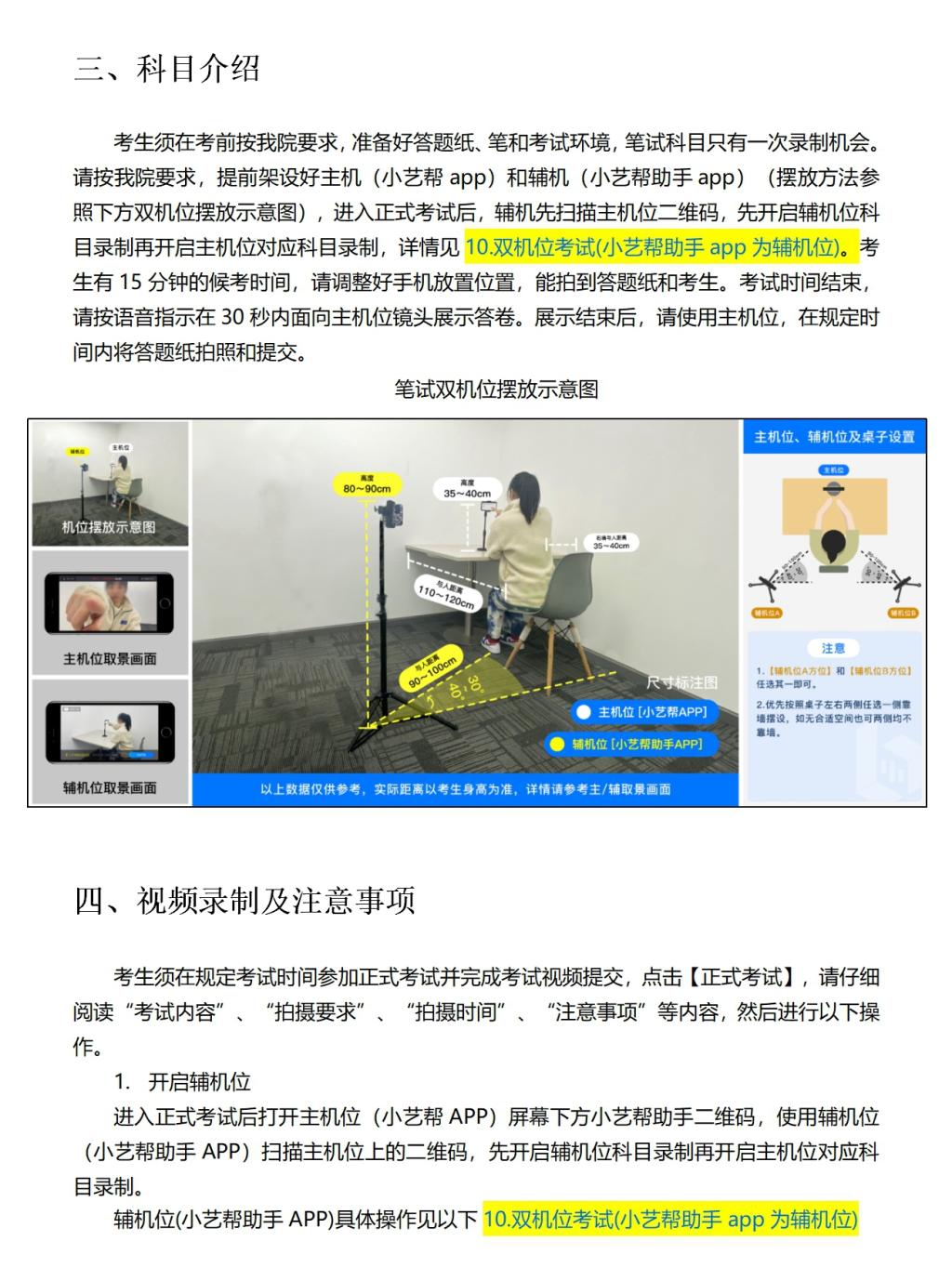 3.采用双机位考试,考生须准备2部手机,主机位竖屏(正面半身)拍摄,辅机位横屏拍摄(考试全景);考试结束时,主机位与辅机位视频都要提交,未提交辅机位视频者,视为违纪,取消该科成绩。