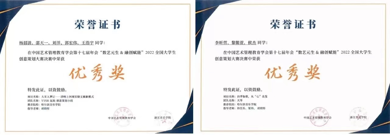 2022年11月,艺术学系派出4个参赛小组参加了由中国艺术管理教育学会主办、中国艺术管理教育学会青年艺管人委员会和浙江音乐学院艺术与文化管理高等研究院共同承办的,主题为“数艺元生&融创赋能”的2022年全国大学生创意策划大赛,本次比赛共有包括清华大学、中央音乐学院、南京艺术学院等全国73所高校的219个项目参赛,我院4个参赛小组均进入决赛,其中2个小组获得此次全国大学生创意策划大赛优秀奖。