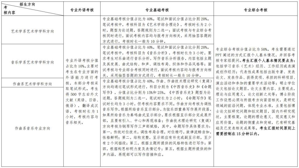 4月中下旬研究生部将组织开展准考审核工作,确定准考名单。实行专家评分制,按照教学系或学科方向设立考试准考审核专家组,根据考生的科研或艺术实践业绩、学科专业背景、学习工作经历、硕士学位论文等情况进行综合评价打分。每个导师(导师团队)原则上(不区分研究方向)按照考录比3:1的比例确定准考名单。音乐专业根据考生报考年龄和是否具有高水平艺术实践业绩将考生分为A档和B档。A档考生近五年应获得过国家级艺术比赛(展演)三等奖及以上奖项1项或参加过国家级重大演出活动2次,且至网报截止日期年龄不超过33周岁。