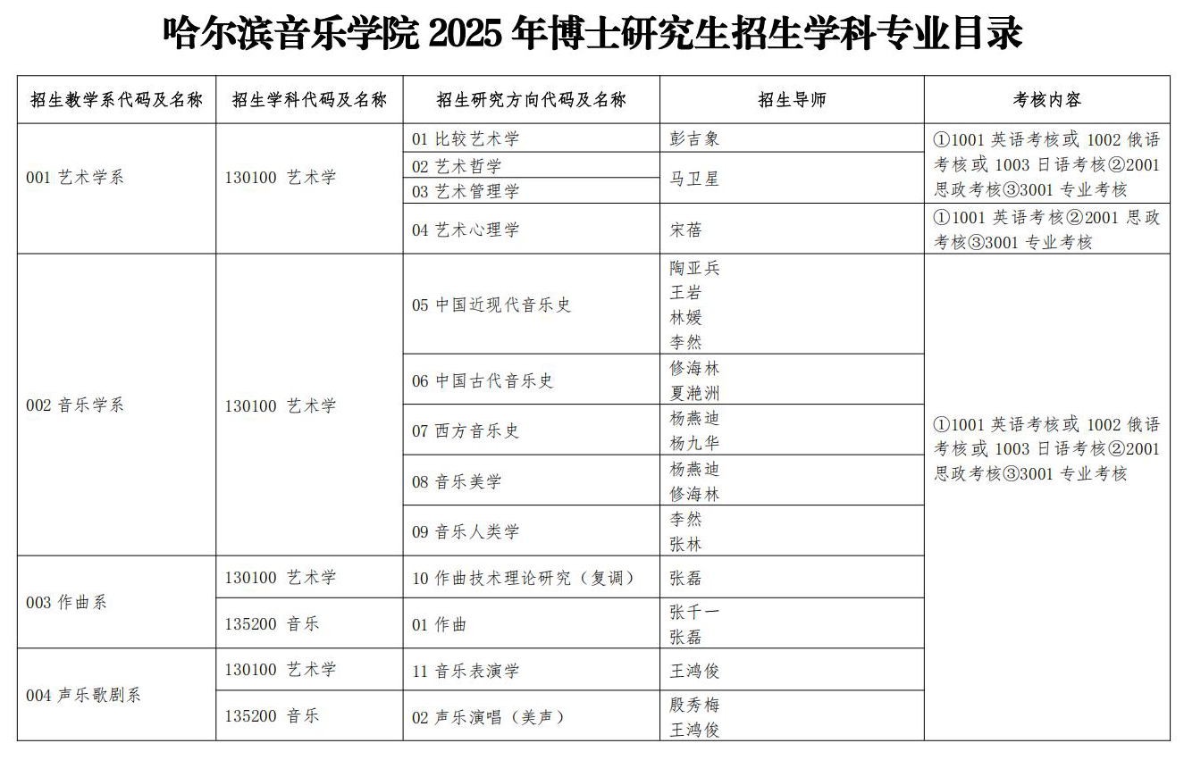 我院2025年博士研究生招生学科专业为艺术学一级学科博士学位授权点和音乐专业博士学位授权点,其中艺术学一级学科招生方向为12个,音乐专业招生方向为8个。