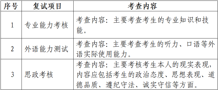 复试内容主要包括三项,即专业能力考核、外语能力测试、思政考核,采用现场复试方式。