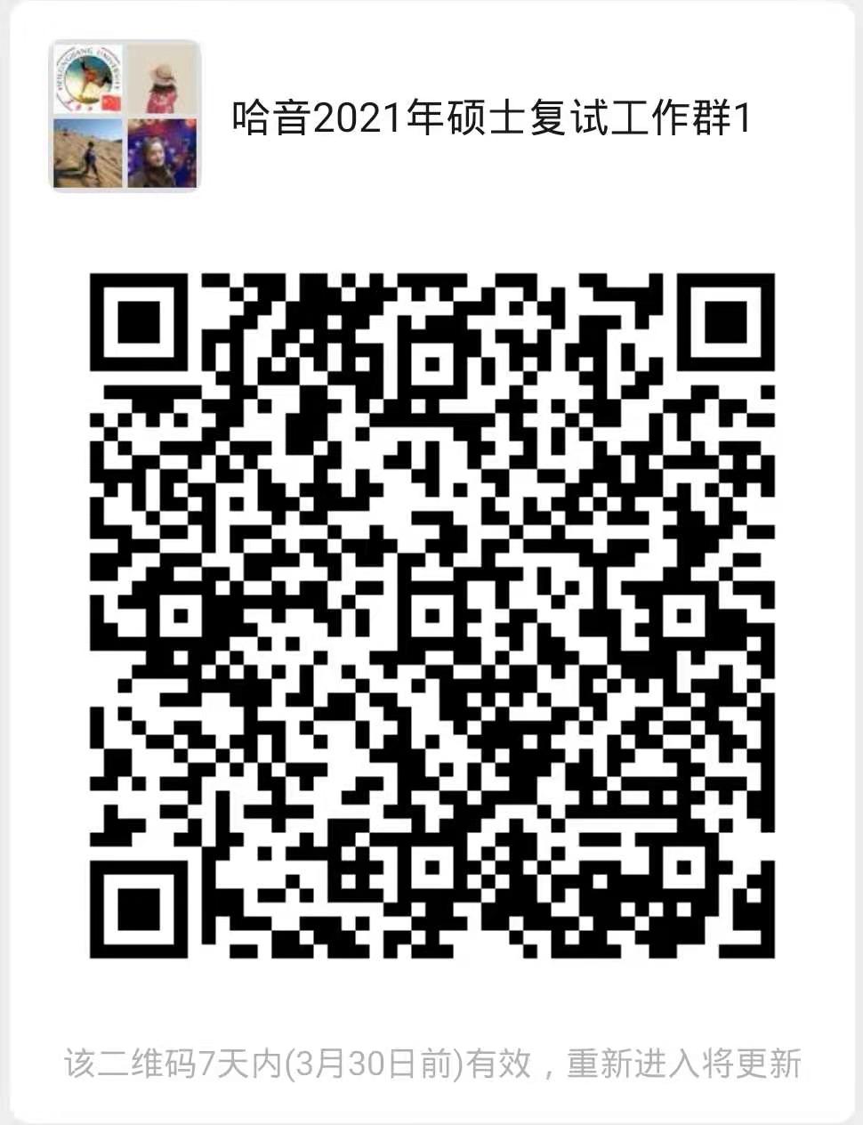 为进一步做好我院2021年硕士研究生复试工作,进一步提高为考生服务的质量,及时有效地向考生传递复试招生等相关信息,根据《永利23411集团2021年硕士研究生招生复试录取工作方案》工作安排,我院决定建立2021年硕士复试微信群。请我院一志愿上线考生和在调剂系统中接受复试通知的调剂考生扫码入群,群名为:哈音2021年硕士复试工作群1。入群之后,请考生将自己的备注改为:姓名+考生编号。二维码如下: