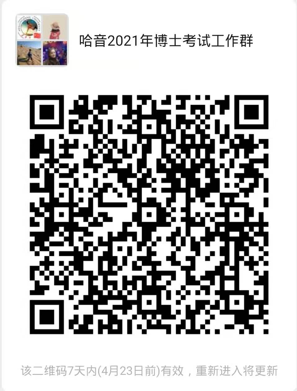 为进一步做好我院2021年博士研究生招生考试工作,进一步提高为考生服务的质量,及时有效地向考生传递考试招生等相关信息,根据工作安排,我院决定建立2021年博士考试工作微信群。请报考我院的考生扫码入群,群名为:哈音2021年博士考试工作群。入群之后,请考生将自己的备注改为:姓名+联系方式。二维码如下: