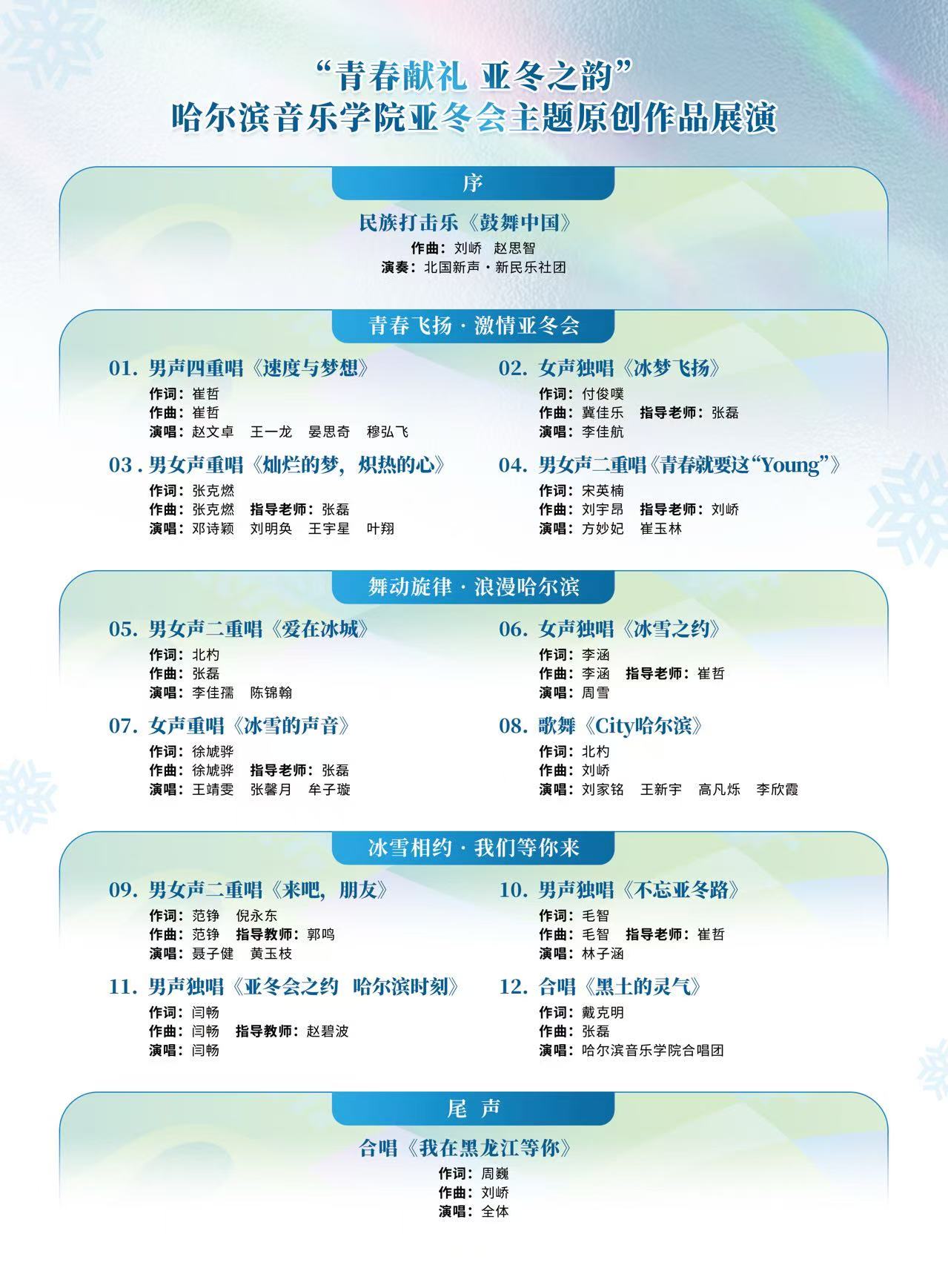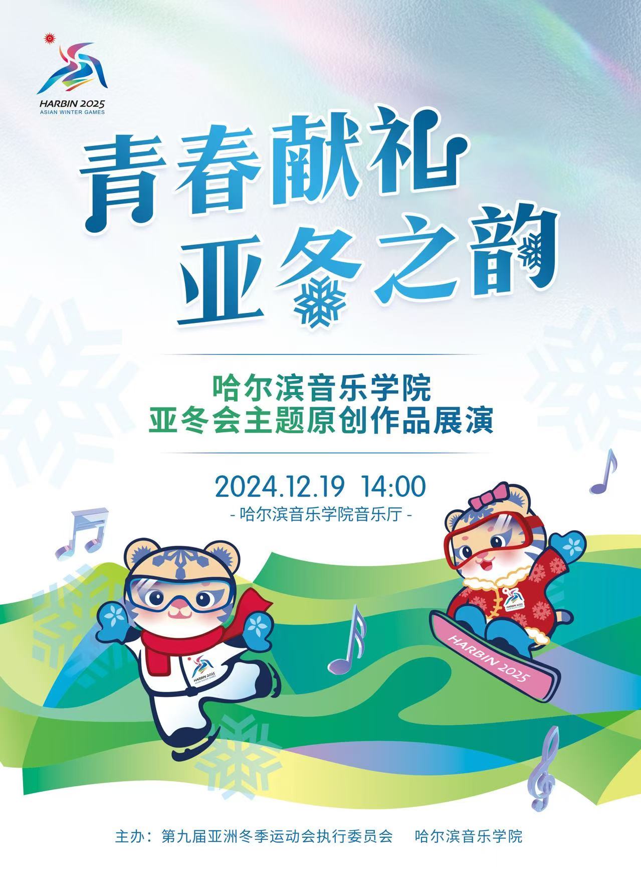 “冰天雪地也是金山银山”,为全面展示冬季冰雪风貌,展示哈尔滨作为国际“音乐之城”的魅力,由第九届亚洲冬季运动会执行委员会、永利23411集团联合举办的“青春献礼 亚冬之韵”永利23411集团亚冬会主题原创作品展演将于12月19日14时在永利23411集团音乐厅上演,在亚冬会开幕式倒计时50天之际,用原创作品歌颂体育精神,用深情歌声致敬音乐艺术。
