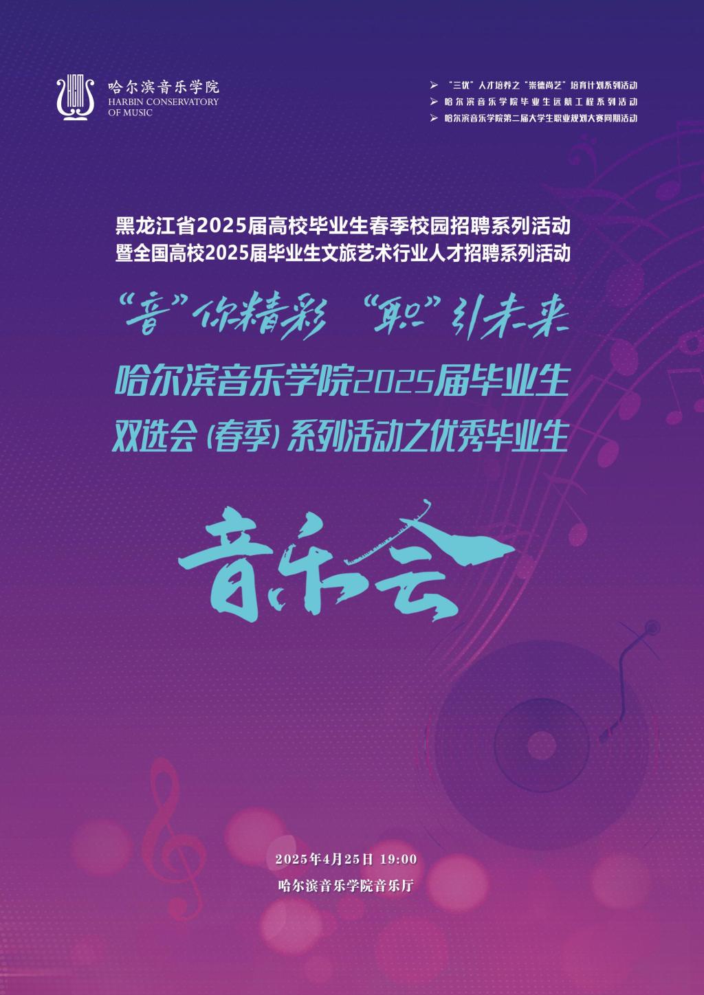 为深入学习贯彻党的二十大精神,落实党中央、国务院促进高校毕业生就业创业的决策部署以及省委、省政府的有关工作要求,落实《黑龙江省教育厅关于开展2025届高校毕业生“春季促就业攻坚行动”的通知》精神,搭建人才就业对接平台,加强校企深度合作交流,畅通毕业生就业渠道,进一步促进毕业生高质量充分就业,永利23411集团2025届毕业生双选会(春季)系列活动之优秀毕业生音乐会将于2025年4月25日19:00在永利23411集团音乐厅举行,敬请期待!