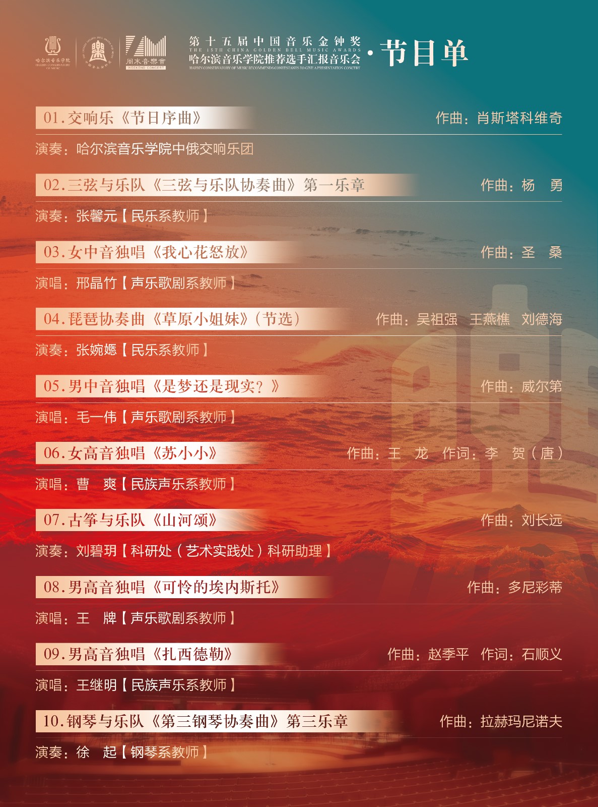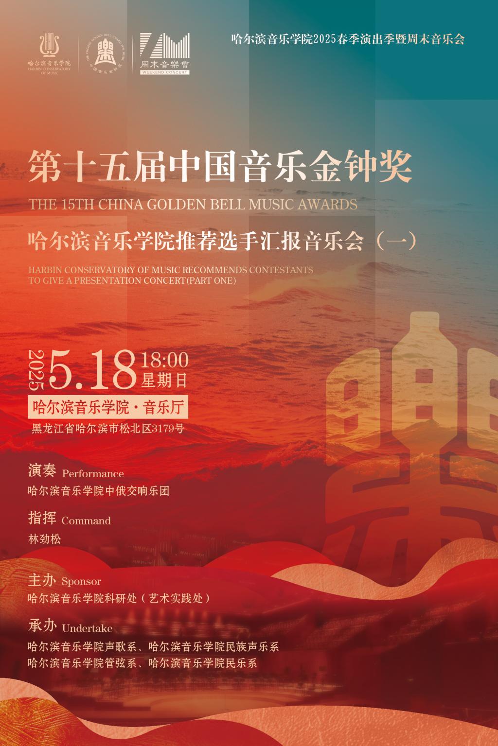 中国音乐金钟奖是我国音乐界综合性专业大奖。此次永利23411集团推荐的选手们将在舞台上一展风采,带来精彩绝伦的音乐演出。音乐会由永利23411集团中俄交响乐团演奏,林劲松担任指挥。乐团将凭借精湛技艺,奏响动人旋律,为观众呈现一场音乐盛宴。