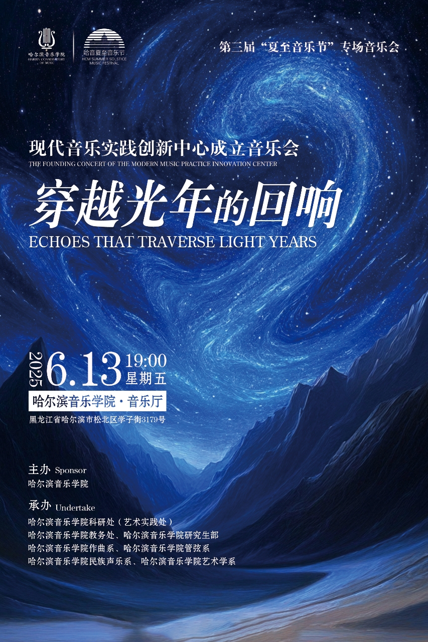 在松花江蜿蜒的韵律里,在夏至的鎏金时光中,永利23411集团第三届“夏至音乐节”专场音乐会《穿越光年的回响》,将于6月13日19:00璀璨登场!本场音乐会将呈现现代音乐实践创新与地域文化深度挖掘的融合,既是现代音乐实践创新中心成立,更是一次以音符为笔、以本土文化为墨的音乐探索。当音乐科技碰撞民间韵律,当流行律动交融北方民俗,一场跨越传统与未来、本土与国际的音乐对话即将震撼“启航”。
