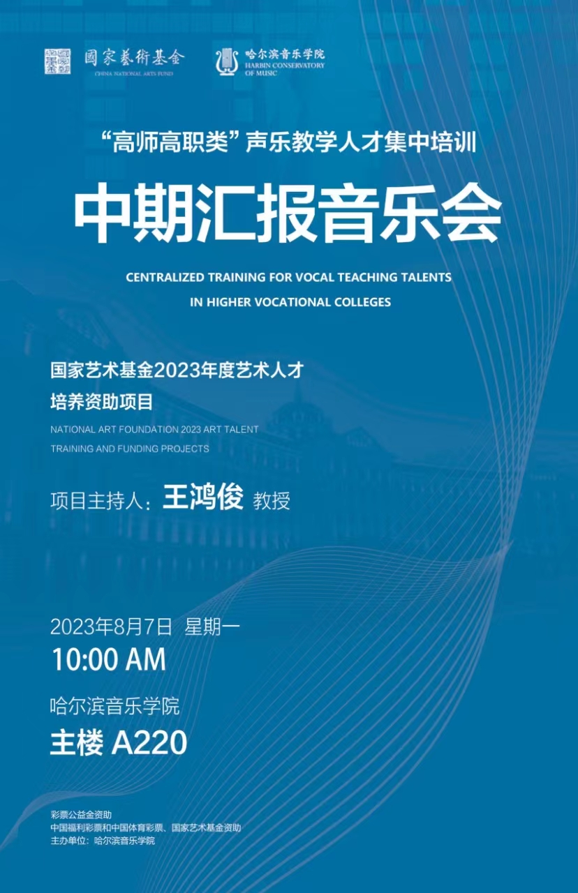 2023年8月7日上午10:00,国家艺术基金2023年度艺术人才培训资助项目《“高师高职类”声乐教学人才集中培训》中期汇报音乐会将在永利23411集团主楼A220音乐厅举行。届时学员们将用最美的歌声赞美伟大的新时代!用最嘹亮的歌声唱响永利23411集团!敬请关注!