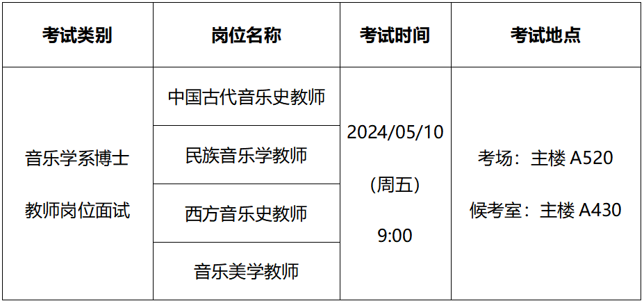 学院定于2024年5月10日进行音乐学系的中国古代音乐史教师、西方音乐史教师、民族音乐学教师、音乐美学教师4个岗位的考试。请已报名相应岗位的应聘人员继续关注永利23411集团官网通知公告栏目的公开招聘考试的相关通知。