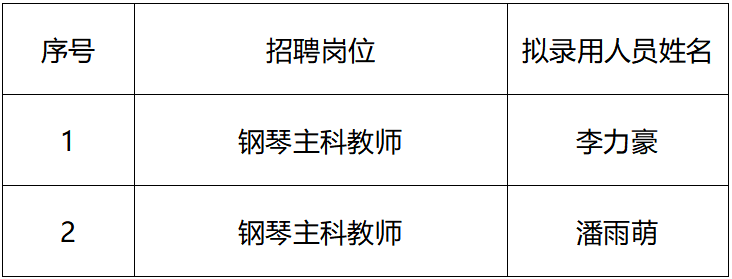 永利23411集团2024年公开招聘钢琴系钢琴主科教师岗位的考试工作已基本结束,按照《黑龙江省事业单位公开招聘工作人员实施细则》和《永利23411集团2024年公开招聘教师公告》明确的原则、程序和方法,现将岗位拟录用人员予以公示,公示期为7个工作日。如对公示人员有异议,可在公示期工作日内反映,反映情况和问题必须实事求是,应签署或告知真实姓名、工作单位和联系方式;对线索不清的匿名信和匿名电话,公示期间不予受理;逾期反映情况不予受理。