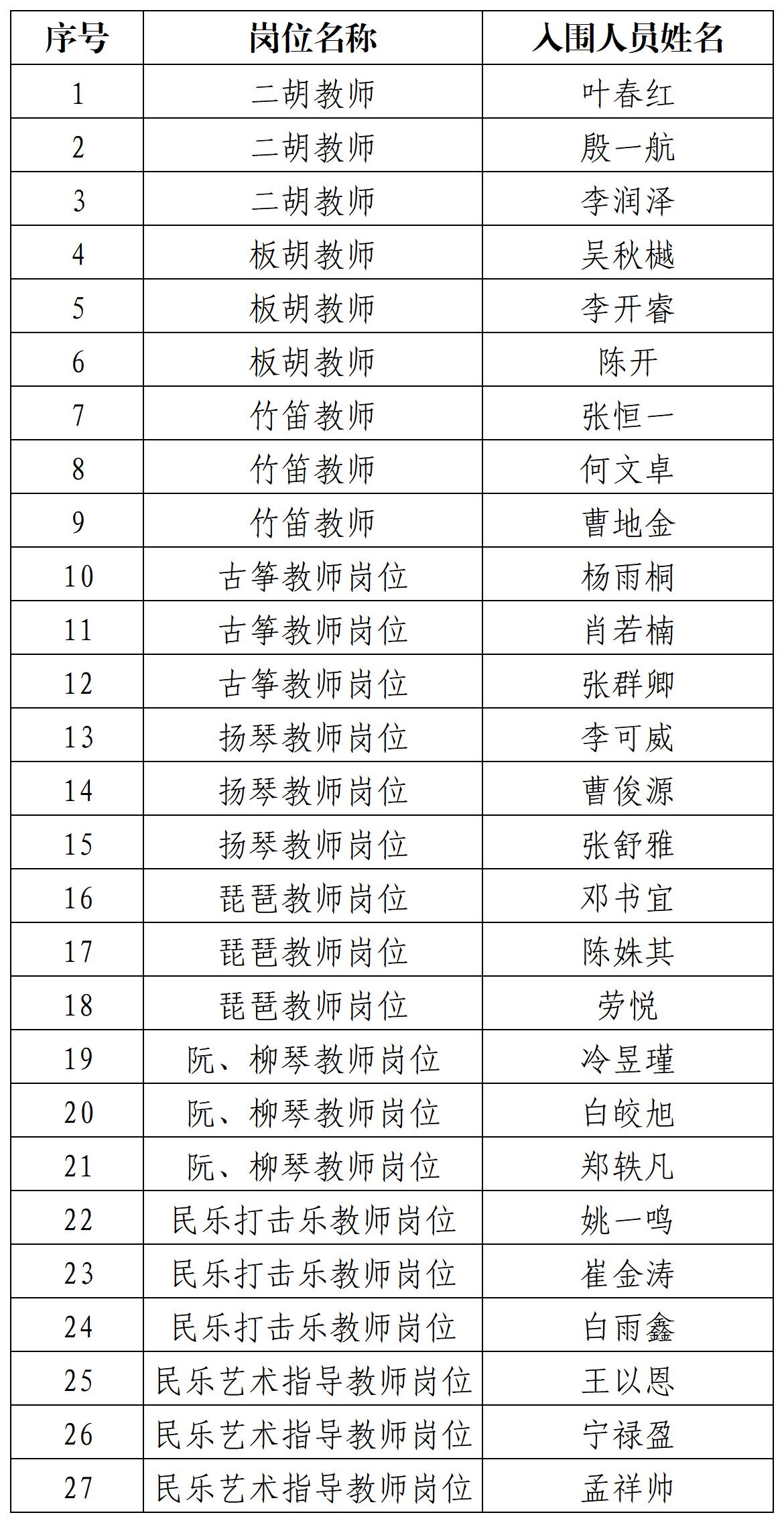 按照《永利23411集团2024年公开招聘教师公告》的有关要求,我院于2024年6月8日-12日对民乐系二胡教师、板胡教师、竹笛教师、古筝教师、扬琴教师、琵琶教师、阮、柳琴教师、民乐打击乐教师、民乐艺术指导教师9个教师岗位的应聘人员进行了专业技能视频初选考核。根据考核成绩,按照进入现场考试的人员确定规则,确定了进入现场考试人员名单,人员名单如下: