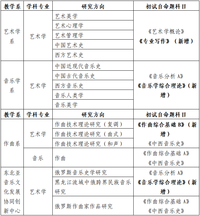 新增初试自命题考试科目为《专业写作》《音乐学综合理论》《作曲综合基础B》,具体大纲详见附件。正式的考试科目和考试大纲请具体以我院后续实际公布的2026年硕士研究生招生考试专业目录和考试大纲为准。
