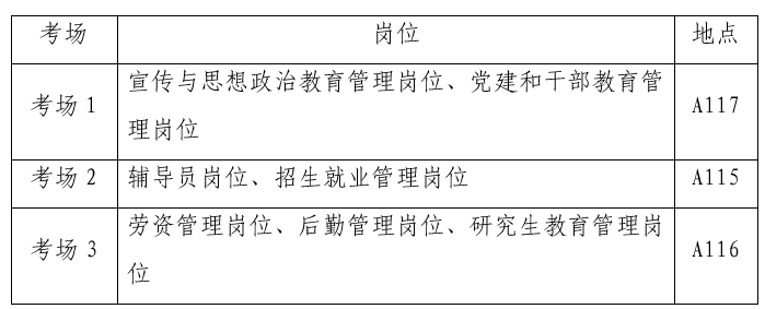 管理岗位和辅导员岗位考试内容包括公共基础知识、行政职业能力测验和申论,卷面总分100分;宣传与思想政治教育管理岗位、党建及干部教育管理岗位需加试政论文写作,政论文写作满分100分,成绩低于60分的不予录用,政论文写作分数与笔试分数各占50%,折合后的总成绩作为笔试成绩。