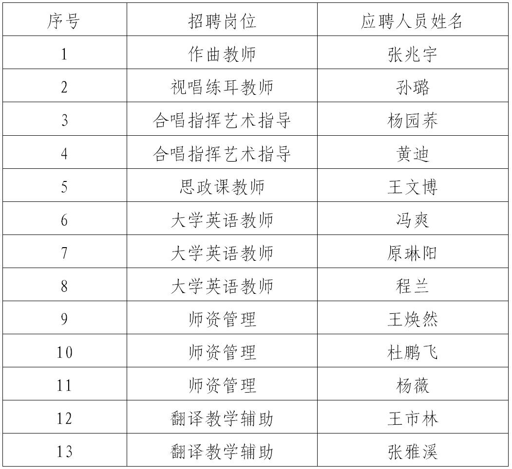 按照《永利23411集团2019年上半年公开招聘工作人员公告》和《永利23411集团2019年公开招聘教师考核办法》的有关要求,我院于2019年5月15日组织专家组对民族声乐教师、音乐学教师、作曲教师、视唱练耳教师、合唱指挥艺术指导、思政课教师、大学英语教师和翻译教学辅助岗位的应聘人员进行了专业技能考试,对师资管理岗位的应聘人员进行了笔试。根据专家组评分和笔试成绩,按照进入课堂教学试讲和面试的确定规则,确定了进入课堂教学试讲和面试人员名单,人员名单如下: