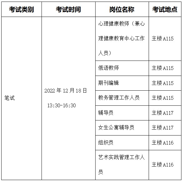 我院定于2022年12月16日(周五)进行辅导员、组织员、心理健康教师(兼心理健康教育中心工作人员)、俄语教师、期刊编辑、女生公寓辅导员、艺术实践管理工作人员、教务管理工作人员8个岗位的现场确认,12月18日(周日)进行上述8个岗位的笔试。请应聘人员持续关注永利23411集团网站相关通知。