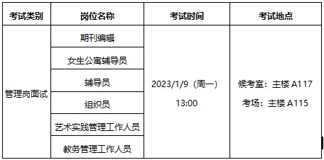 我院定于2023年1月9日进行期刊编辑、女生公寓辅导员、辅导员、组织员、艺术实践管理工作人员、教务管理工作人员6个岗位的面试。请通过笔试的应聘人员按时参加面试。