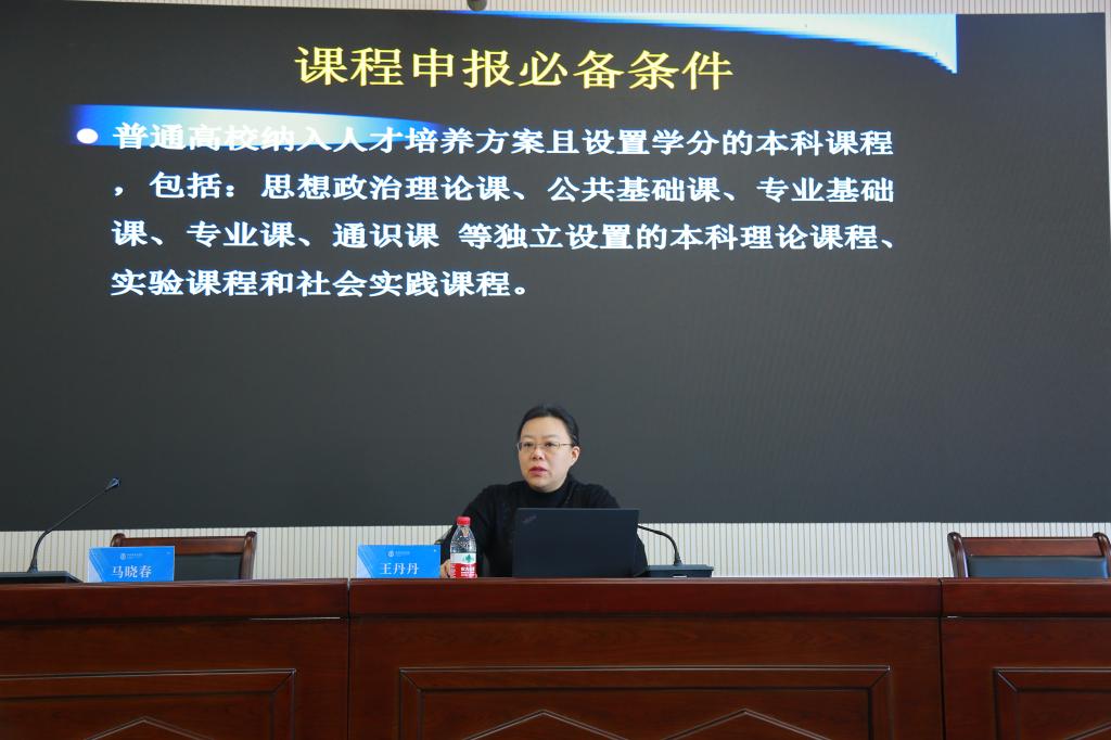 马晓春在主持时指出,王丹丹教授从文化互鉴、课程思政、核心素养、教研融合和支撑体系等方面讲解了一流课程的培育及申报历程,深入浅出,令参训教师受益匪浅,为学院今后的课程建设提供了宝贵的经验和借鉴。希望参训教师认真领悟培训要点、加强课程思政改革与建设,做好一流课程申报相关工作。