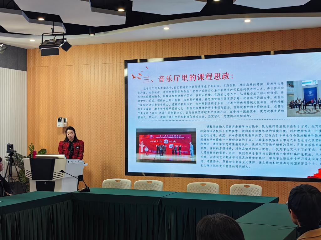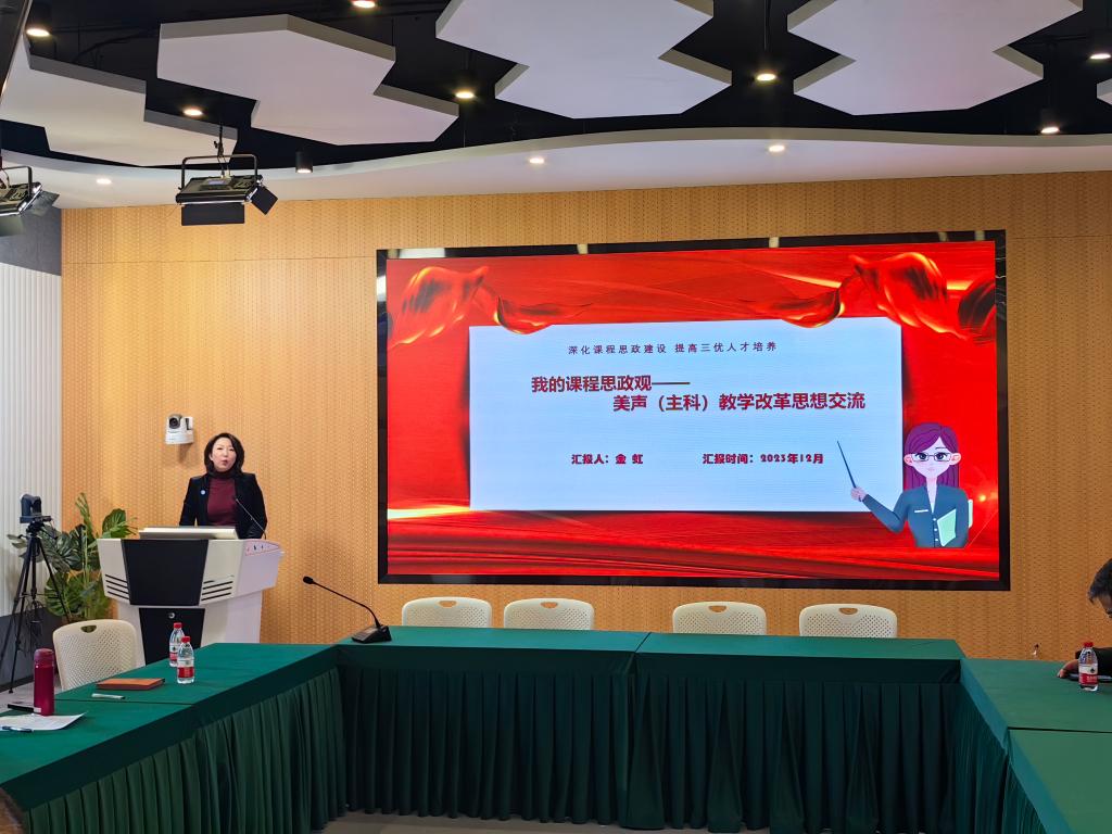 声乐歌剧系教授金虹以“我的课程思政观——美声(主科)教学改革思想交流”为主题,从讲好信仰之“理”、唱好历史之“实”、教好专业之“精”、建好服务之“诚”、构好环境之“美”五个方面讲解了自身对课程思政建设的认知。