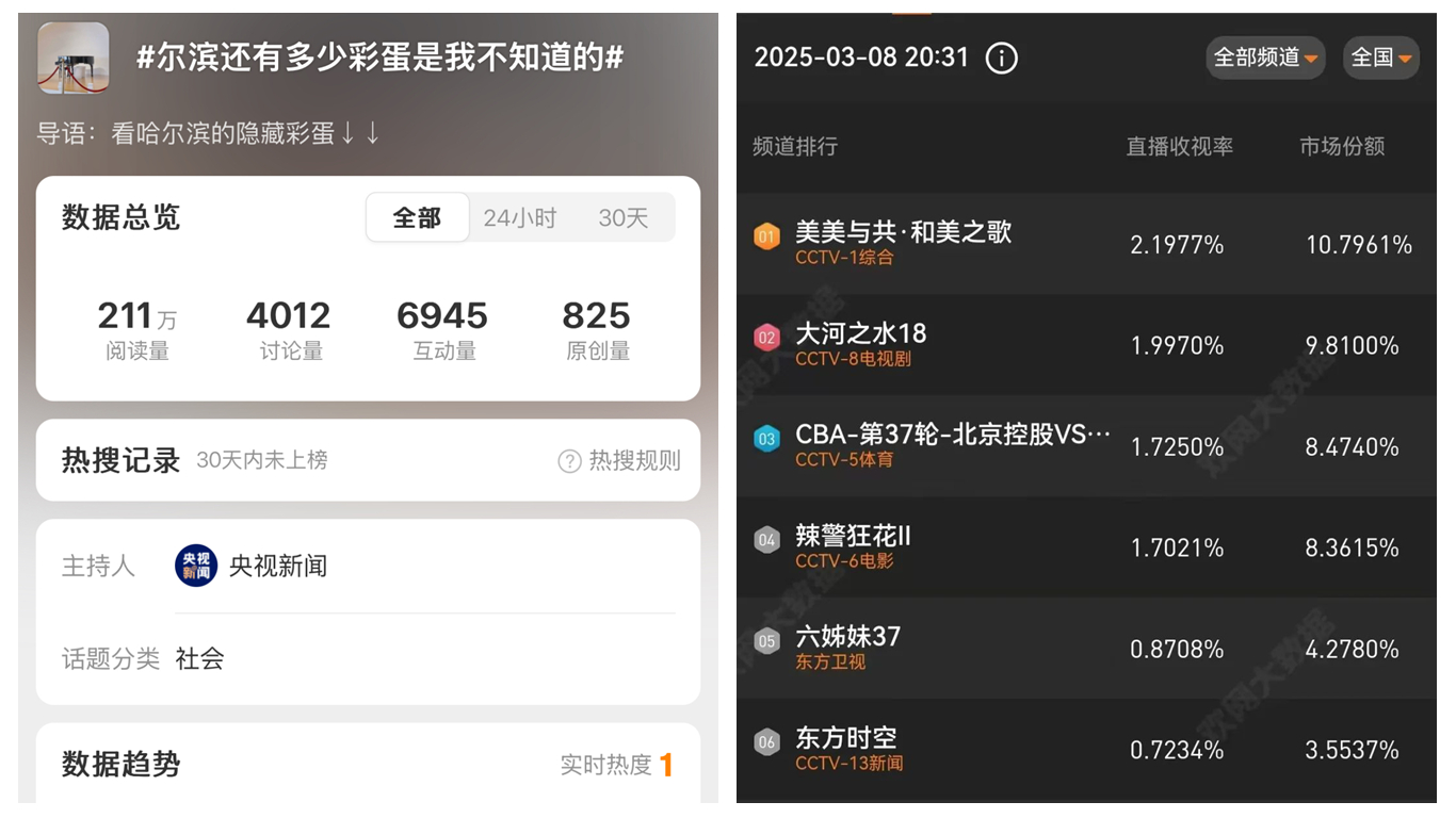 节目一经播出,受到媒体、网友的广泛关注。节目直播收视率位居实时第1位,央视新闻、央视频、央视一套、哈尔滨新闻网、哈尔滨广播电视台等多家媒体转发相关信息。微博话题#尔滨还有多少彩蛋是我不知道的#阅读量高达245.7万。