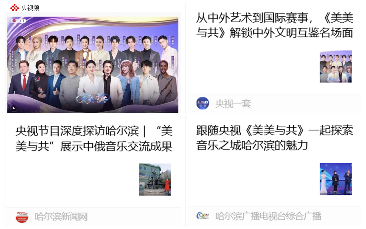 3月8日20:00档,由中央广播电视总台、文化和旅游部联合摄制的大型国际文化交流节目《美美与共·和美之歌》新一期节目在总台央视综合频道(CCTV-1)播出,央视频、央视网同步播出。