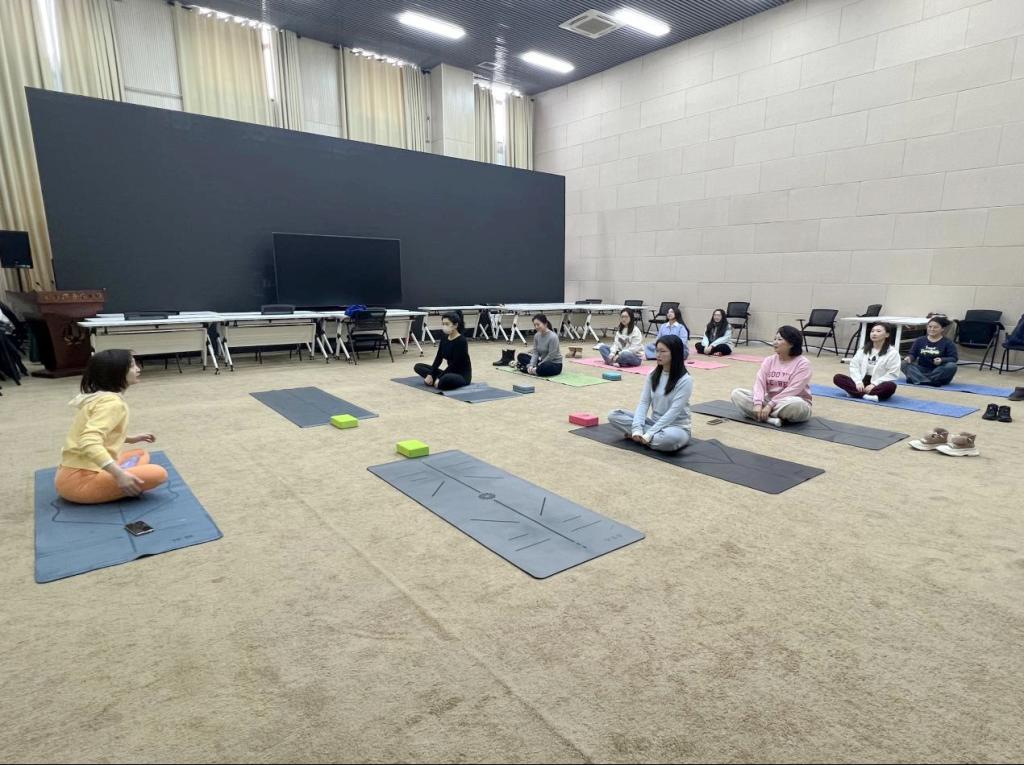 杨帆老师指导各位教职工练习基础的呼吸法,示范各种体式,大家跟随着口令,伸展、扭转、平衡。在一呼一吸之间,压力得到释放,脸上洋溢着自信与平和的笑容。