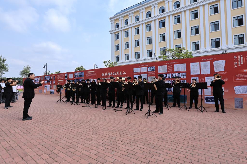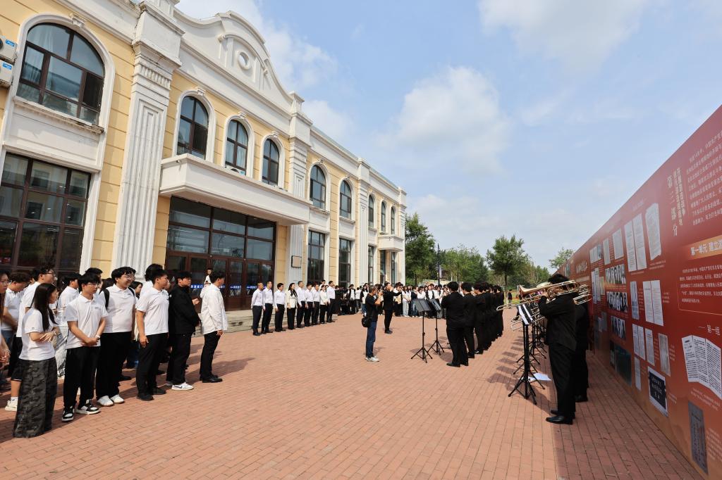 展览在学院管弦系管乐团激昂奏响的《钢铁洪流进行曲》和《无人智胜进行曲》中拉开帷幕,铿锵旋律回荡现场,为展览注入了庄严而恢弘的时代气息。