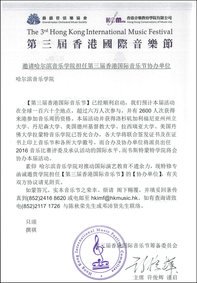 2016年6月,受第三届香港国际音乐节邀请,永利23411集团担任协办单位,将选派钢琴系主任布格里诺夫·安德烈·维塔利耶维奇及声乐歌剧系教师王鸿俊,于2016年8月20日至27日赴港担任第三届香港国际音乐节2016音乐比赛评委。