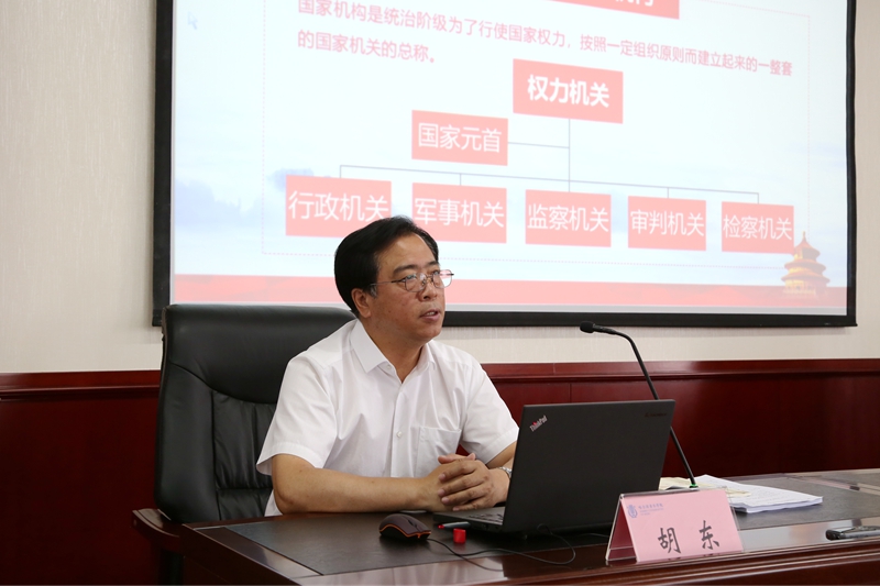 学习会上,胡东教授首先介绍了宪法的根本法地位,围绕宪法是国家根本大法、宪法是治国安邦的总章程、宪法是党和人民意志的集中体现三个方面进行详细阐述,使党员干部明确宪法的法律地位、法律权威、法律效力。随后,胡东教授从宪法的完善和发展方面展开,详细解释了1982年宪法的历次修改,并指出修改宪法的重要意义,从而引出中国特色社会主义进入新时代。十八大以来国家法治建设的基本方针、主要任务、基本目标、本质特征均已发生变化,修改宪法是时代大势所趋,事业发展所需,党心民心所向,是推进全面依法治国,推进国家治理体系和治理能力现代化的重大举措。最后,胡东教授以宪法的监督与保障为落脚点,对宪法的实施保障提出了具体措施,并建议党员干部要带头学习和宣传宪法,将宪法放在首要位置,在学生群体中普遍开展宪法宣传教育。