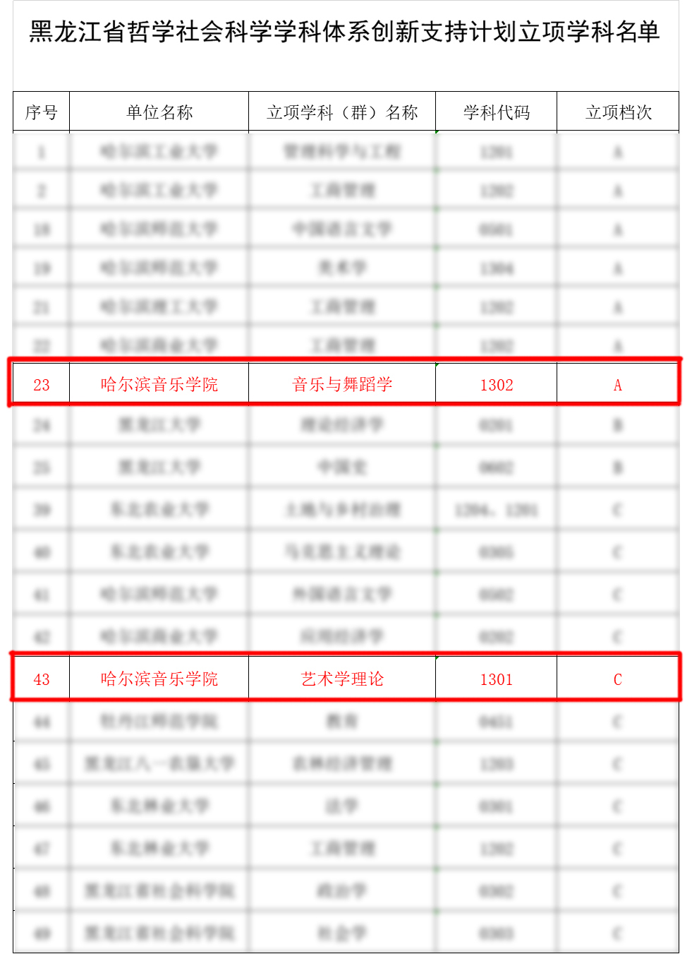 根据中共黑龙江省委宣传部、黑龙江省教育厅等七部门联合出台的《关于印发的通知》和黑龙江省学位委员会、黑龙江省教育厅、黑龙江省财政厅《关于印发的通知》精神,我院音乐与舞蹈学学科和艺术学理论学科成功入选省哲学社会科学学科体系创新支持计划,皆为我省唯一入选的学科,立项档次分别为A和C。