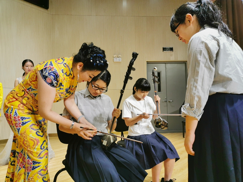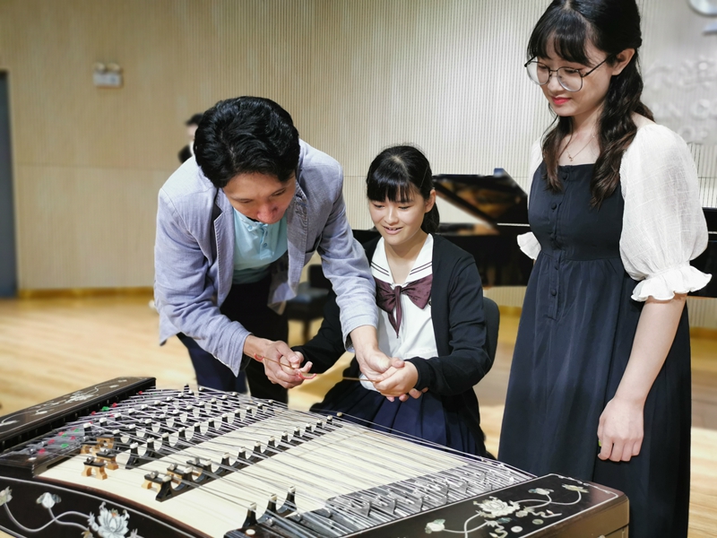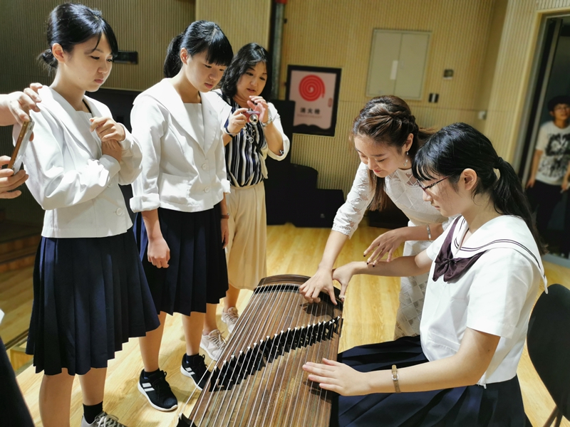 交流演出前,宋立权副院长首先代表学院向日本山形县代表团一行表示热烈欢迎并致欢迎辞。他表示,自我省与山形县于1993年缔结友好省县关系以来,双方在教育、文化、体育、医疗、农林水产等领域开展了卓有成效的交流与合作,并取得了长足的发展。2018年,山形县知事吉村美荣子访问我省时,与王文涛省长就加强两地区青少年交流达成共识,恰逢今年为中日青少年交流促进年,山形县青少年代表团一行到访我院交流访问具有重要意义。接着,山形县青少年代表团在主楼A219(第一演奏厅)观看了由我院民乐系师生精心准备的二胡齐奏《战马奔腾》、中阮独奏《山韵》、古筝独奏《墨客》、扬琴独奏《云端》四个节目;山形县青少年代表团上台倾情演唱四首日本校歌。交流演出后,我院师生与山形县青少年代表团在台上分四组进行民族乐器学习演奏,并进行了亲切互动,现场交流气氛十分友好。
