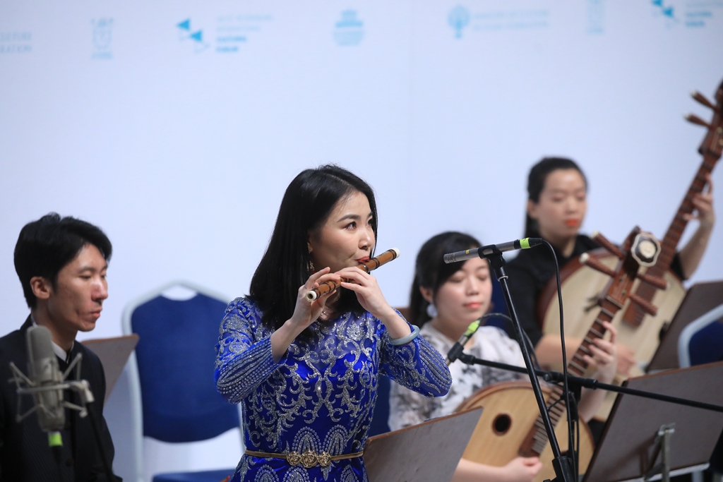 音乐会分为上、下半场。上半场音乐会由我院民乐系主任、特聘教授、著名胡琴演奏家姜克美担任艺术总监,领衔民乐系与民族声乐系师生联袂表演。民乐系教师尚帅的唢呐独奏《百鸟朝凤》,民乐系教师王译茁、肖贺元的古筝与打击乐《行者》,民族声乐系研究生王继明的《乌苏里船歌》,民乐系教师孟晓洁的笛子独奏《牧民新歌》,民乐系师生李孟莹、索帅、刘靖瑄的重奏《山歌》,民族声乐系教师王庆辉的《我爱你塞北的雪》,这一首首具有浓郁中国风情和鲜明龙江特色的民族器乐和声乐作品,让松花江边的哈音旋律乐动涅瓦河畔。姜克美主任的京胡独奏《夜深沉》使音乐会达到高潮。最后,永利23411集团民族室内乐团的全体师生演奏了中国风作品《独克宗》和俄罗斯传统民族音乐《卡琳卡》,中俄合璧、交相辉映的热烈旋律博得现场观众经久不息的掌声。