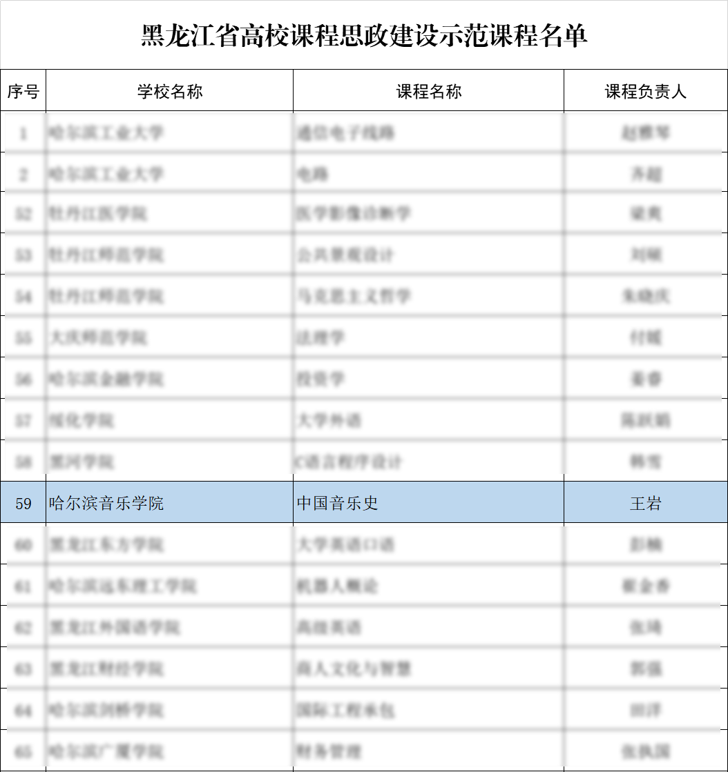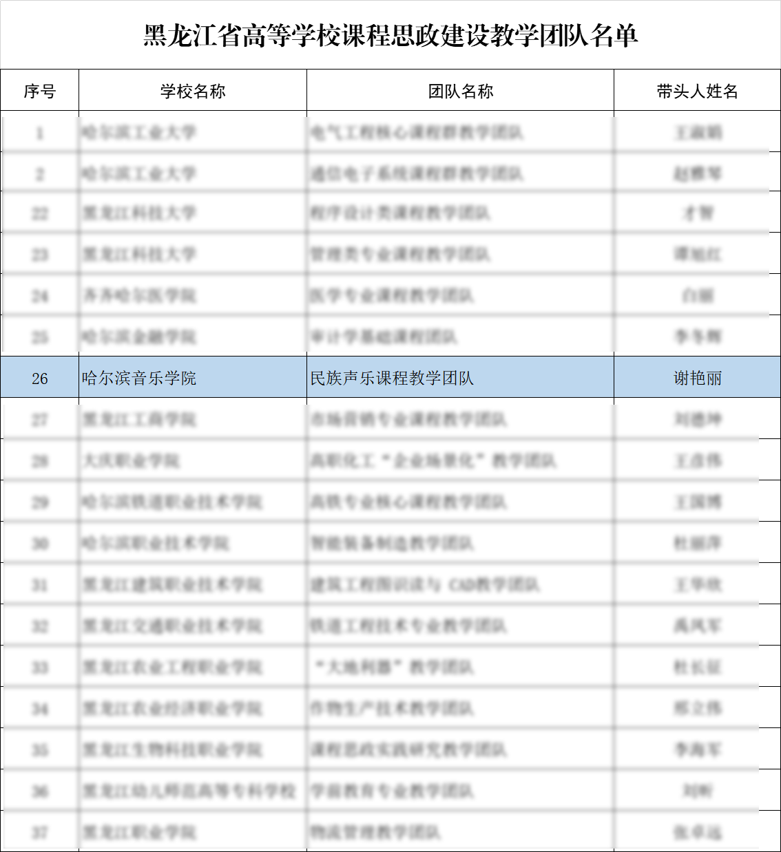 本次评选经本人申报、各教学单位推荐,教务处组织评审、专家进行评审后上报教育厅。教育厅最终评选2020年黑龙江高等学校课程思政建设示范高校10所、示范课程105门、教学名师33名和教学团队37个。我院《中国音乐史》课程是本次评选的课程思政示范课程中唯一一门音乐类课程;民族声乐课程教学团队是本次评选的课程思政教学团队中唯一的音乐类教学团队。