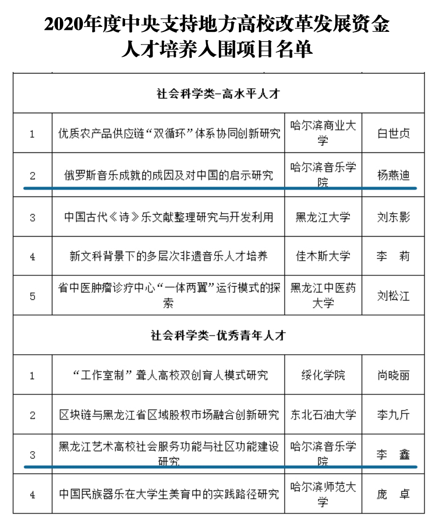 根据《黑龙江省财政厅 黑龙江省教育厅 黑龙江省科学院关于开展2020年度中央支持地方高校改革发展资金人才培养项目申报工作的通知》(黑财函〔2020〕245号)文件精神,我院院长杨燕迪获批社会科学类高水平人才项目资助,获批资助为100万元,管弦系副教授李鑫获批社会科学类优秀青年人才项目资助,获批资助为50万元。