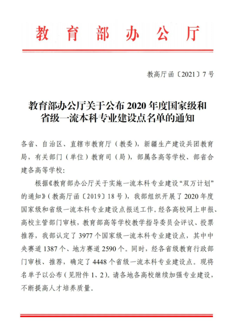 一流本科专业建设“双万计划”是教育部全面振兴本科教育、提高高校人才培养能力、实现高等教育内涵式发展的重要举措,从2019年开始分三年建设10000个左右国家级一流本科专业点和10000个左右省级一流本科专业点。2020年度为第二次申报,本次共认定了3977个国家级一流本科专业建设点(其中中央赛道1387个,地方赛道2590个)。