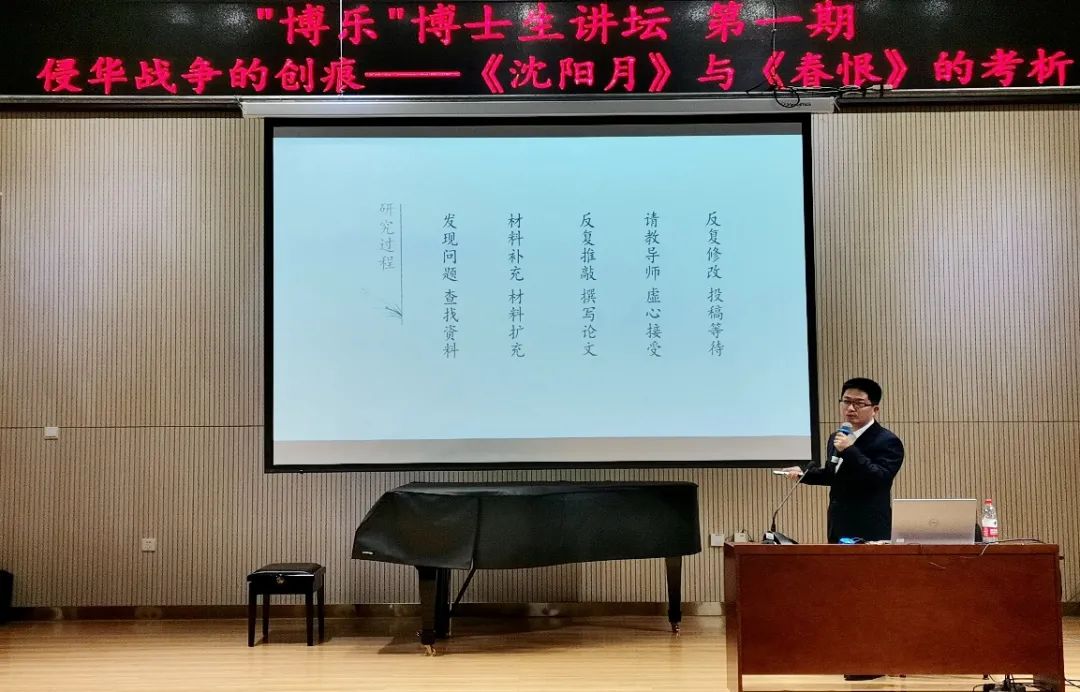 第一讲由音乐学系2019级博士研究生樊右伟和邱洋洋开场。樊右伟以《侵华战争的创痕——<沈阳月>与<春恨>考析》为题,深入分析了反映“九·一八”事变的器乐作品《沈阳月》和南京大屠杀事件的艺术歌曲《春恨》的艺术特点,着重讲解了国人在民族灾难面前表现出的爱国情怀。
