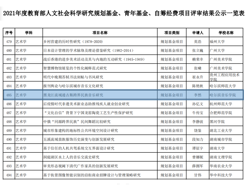 8月3日,教育部公示了2021年度教育部人文社会科学研究规划基金项目评审结果,我院李然教授所申请的项目《黑龙江流域通古斯跨界民族音乐研究》喜获立项资助。