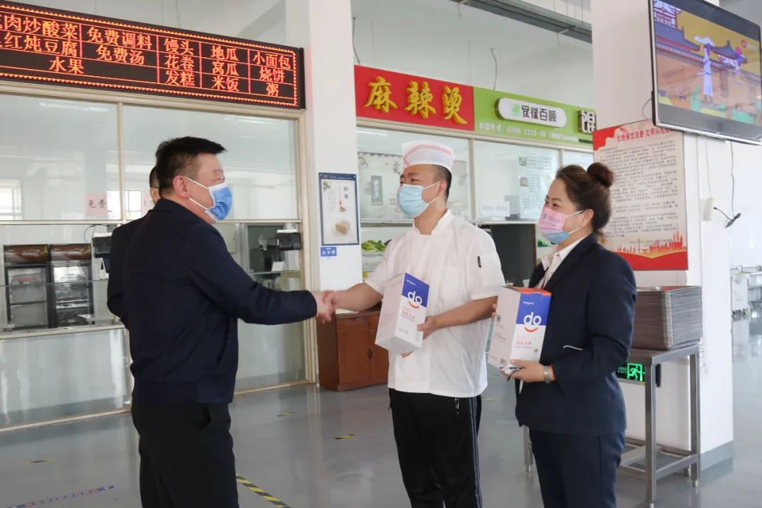 许双毅一行先后到校门口、主楼门卫、快递点、学生食堂等地,询问物业服务人员的工作、生活等情况,将印有防疫留念的水杯送至工作人员手中,对顾全大局、坚守一线、辛勤付出的工作人员表示感谢。