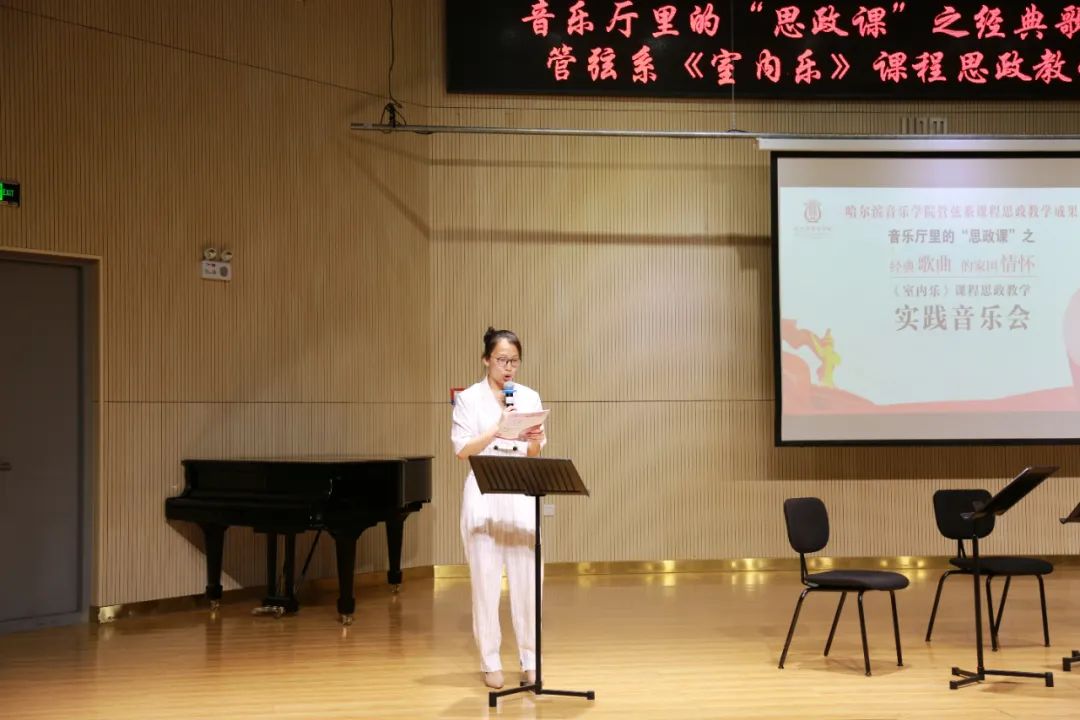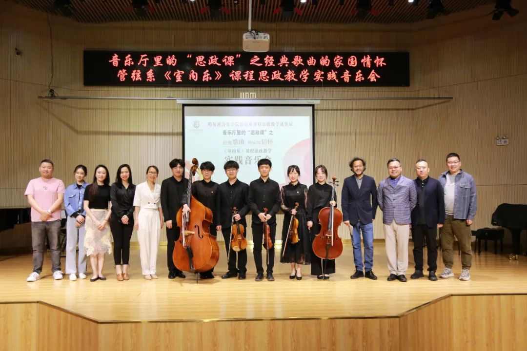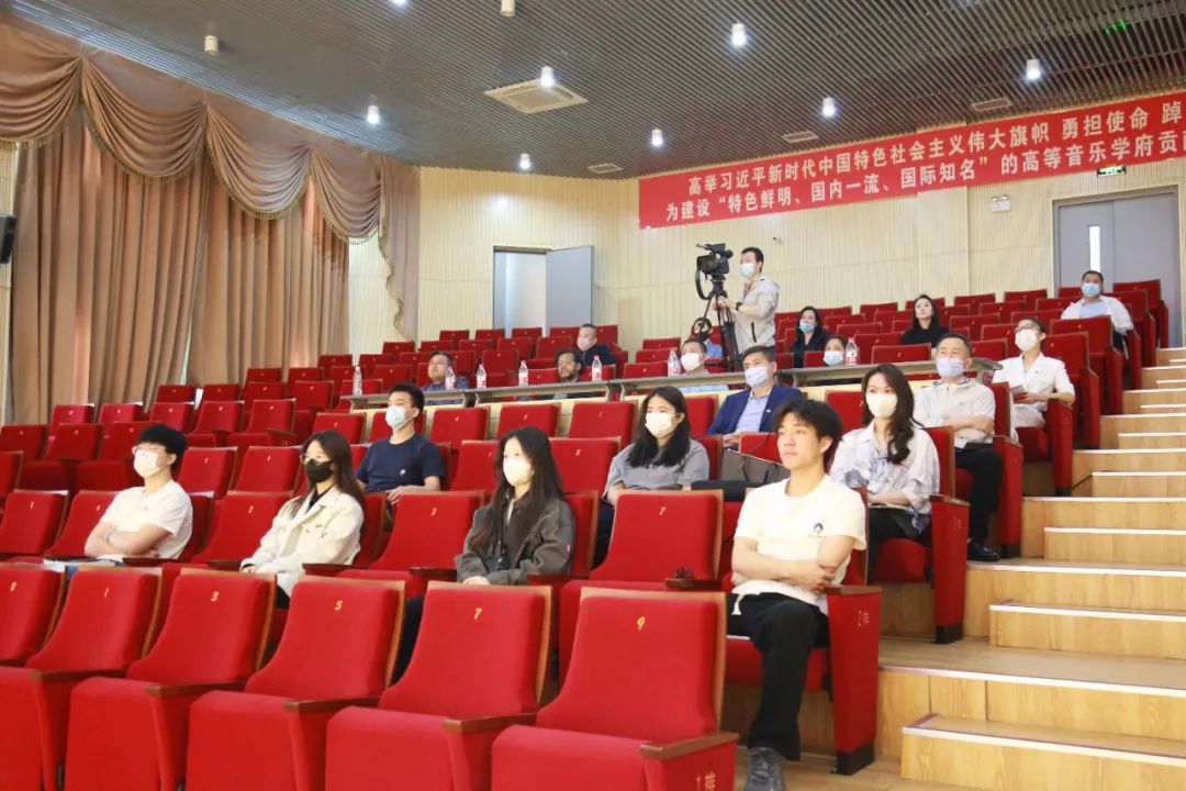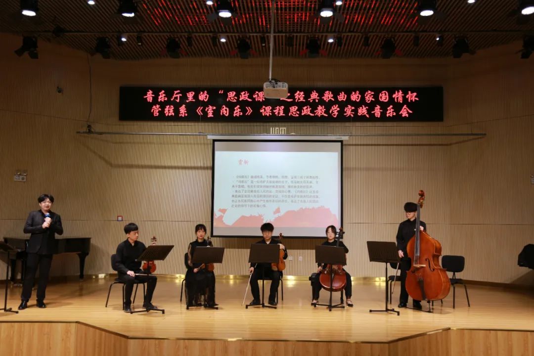 为迎接党的二十大胜利召开,弘扬新时代爱国主义精神,探索开展新时代课程思政教学的实践意义,5月23日,管弦系在A219演奏厅举办音乐厅里的“思政课”之经典歌曲的家国情怀——《室内乐》课程思政教学实践音乐会。学院党委副书记、工会主席刘东兴,纪委书记、党委委员张丽波出席活动,各相关部门、党总支、教学系负责人及管弦系在校教师和学生党员聆听音乐会,音乐会由管弦系党总支书记杨玲主持,管弦系小提琴教师张可涵担任主讲人。