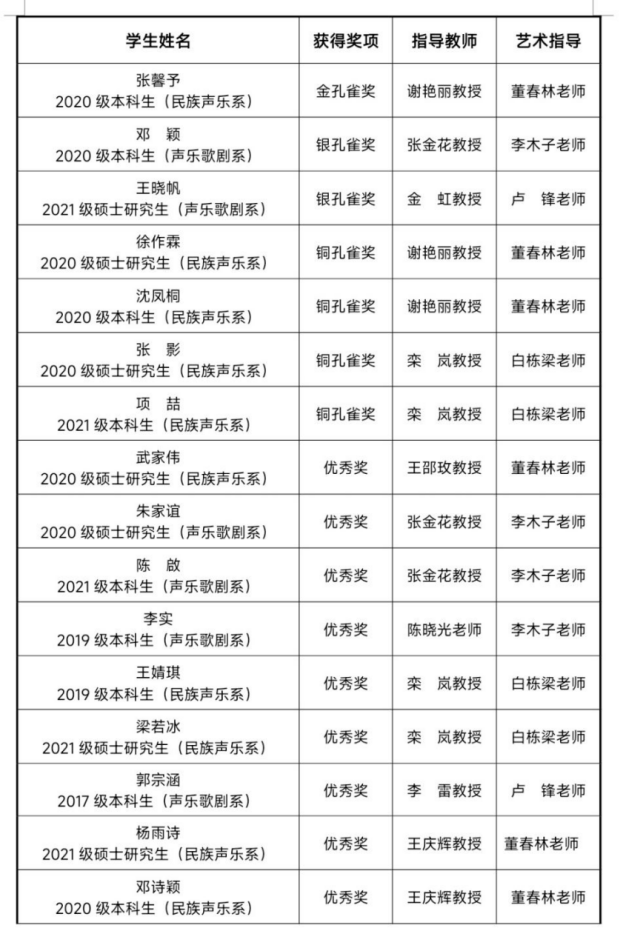 近年来,永利23411集团师生积极参加国内外各级各类艺术实践和音乐比赛,取得优异成绩。此次孔雀杯全国高等艺术院校声乐展演中斩获殊荣,不仅是对学生个人专业水平的肯定,也是师生在教学与艺术实践方面辛勤付出喜结硕果的集中体现,更是学院秉承“双一流”学科建设理念、高度重视与扎实开展教学与艺术实践的集中展示。