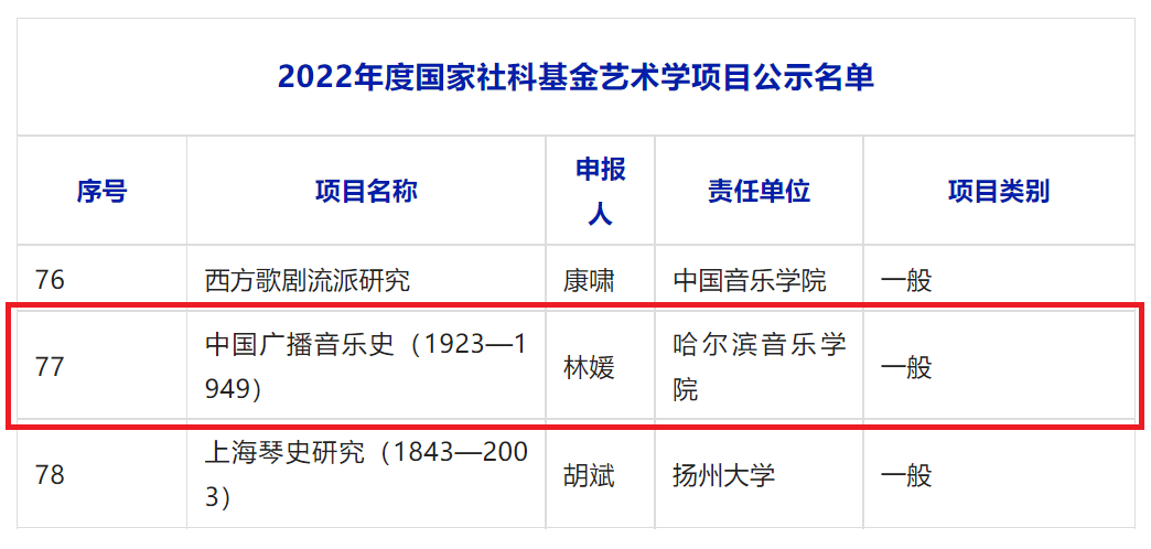 8月31日,全国艺术科学规划领导小组办公室公布了2022年度国家社科基金艺术学项目立项名单,我院音乐学系教授林媛申报的“中国广播音乐史(1923-1949)”喜获立项。这是建院以来我院教师获得的第5项国家社科基金艺术学项目。