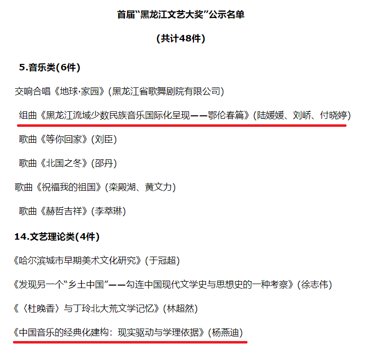 日前,中共黑龙江省委宣传部公示了首届“黑龙江文艺大奖”获奖作品名单。我院院长杨燕迪的文艺理论类作品《中国音乐的经典化建构:现实驱动与学理依据》,作曲系副教授刘峤、民族声乐系副教授付晓婷等创作的组曲《黑龙江流域少数民族音乐国际化呈现——鄂伦春篇》荣获首届“黑龙江文艺大奖”。