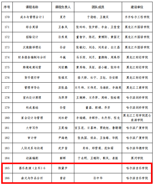 近日,黑龙江省教育厅公示了第三批省级一流本科课程认定结果。学院管弦系教师陈黛梦申报的《器乐表演(主科)6》和作曲系教授曾岩申报的《曲式与作品分析》2门课程荣获黑龙江省第三批省级一流本科课程。截至目前,学院共获批省级一流本科课程5门。
