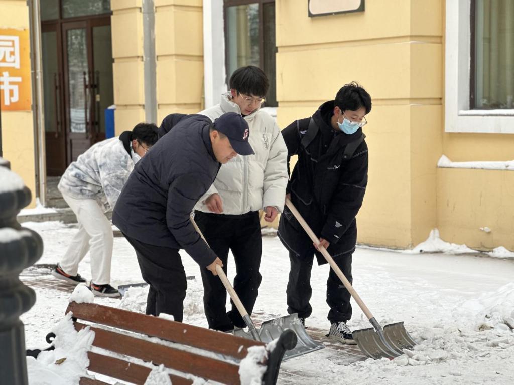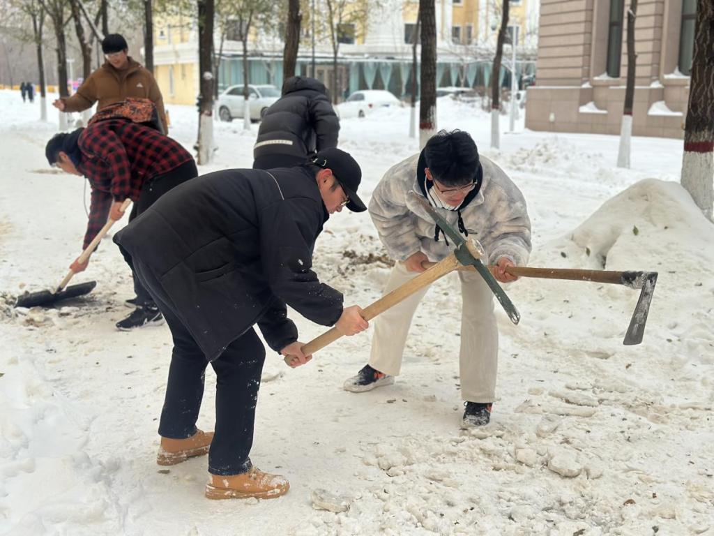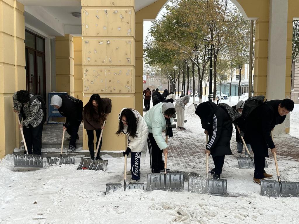寒风中,同学们热火朝天,干劲十足,齐心协力将道路上的积雪清扫干净,最大程度上减少了积雪带给同学们的安全隐患,保障了同学们的出行安全。