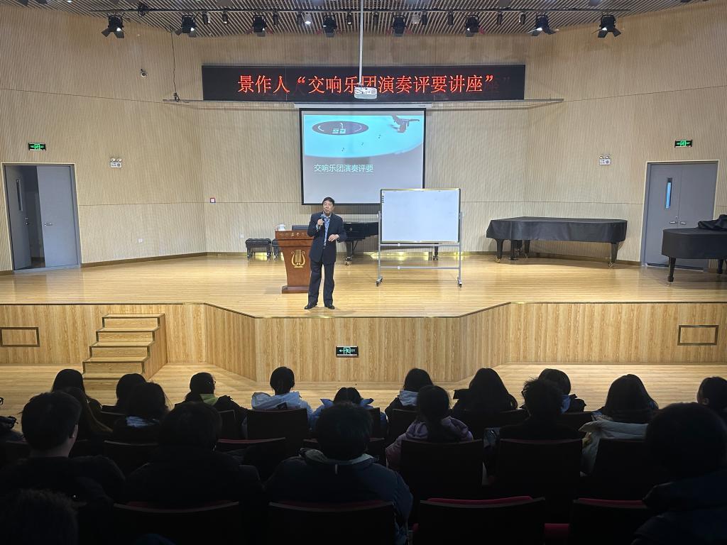 11月24日上午,著名音乐评论家、音乐学家、中央歌剧院交响乐团中提琴演奏家、国家一级演奏员景作人教授主讲题为“交响乐团演出评要”讲座在A219演奏厅成功举办。景作人根据自己多年的教学经验,用生动风趣的讲授,分享了交响乐团演出需要注意与提升的知识,使现场的师生受益匪浅,为管弦系青年交响乐团的发展提供了极大的帮助。