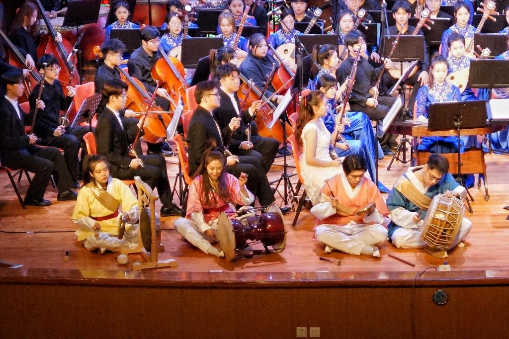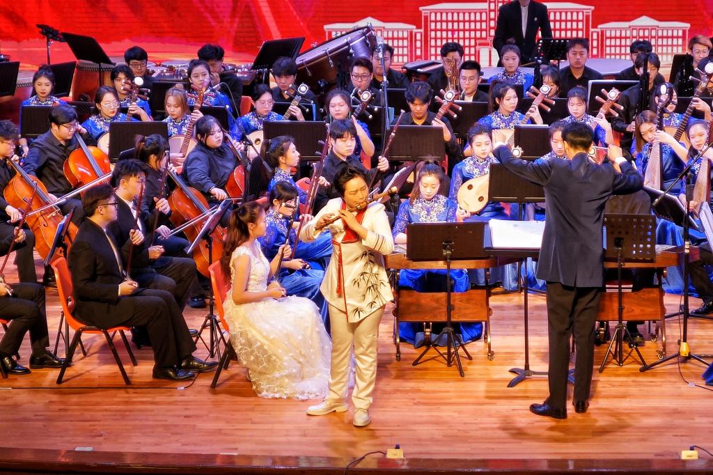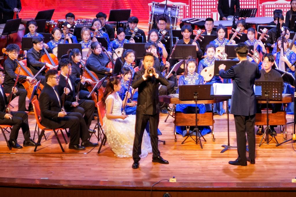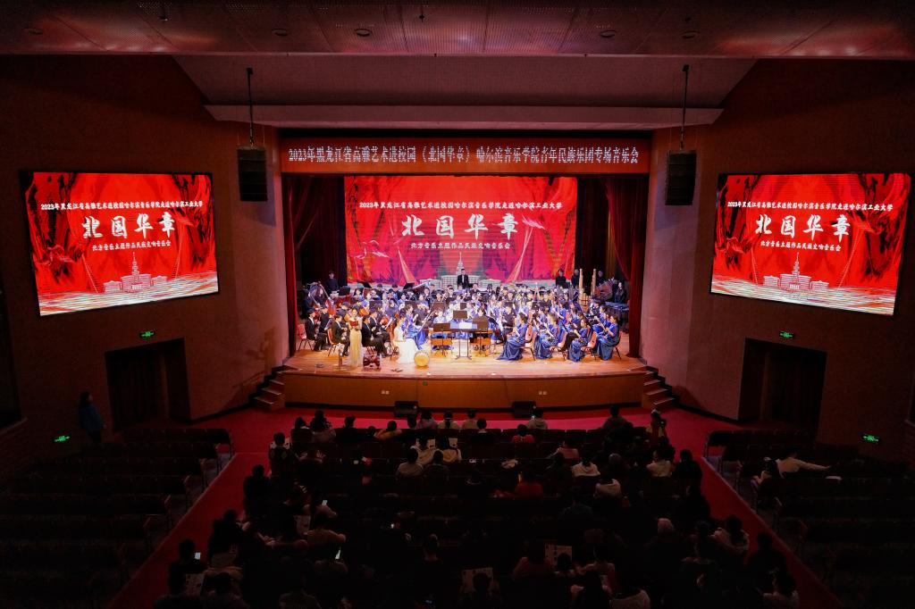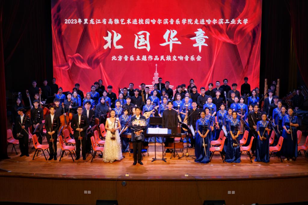 《北国华章》——东北主题原创作品民族交响音乐会,以中国东北民族民间音乐文化为主题,用国乐之声赞美祖国,向党抒怀,探索中华优秀传统民族音乐传承与创新,是永利23411集团增进音乐文化自信自强,推动音乐文化繁荣发展,深入开展学习贯彻习近平新时代中国特色社会主义思想主题教育的阶段性成果。音乐会的演出,不仅为哈音师生提供了艺术实践的平台,也让哈工大的师生有了一次零距离接触高雅艺术的机会。哈工大300多名师生现场观看演出,气氛热烈,掌声不断,演奏结束后,师生们流连忘返,意犹未尽,久久不愿离去。