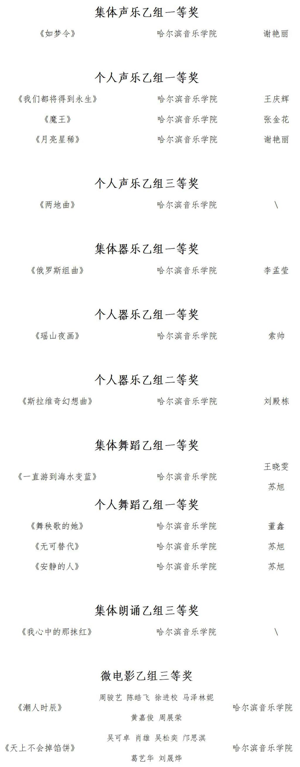 近日,由黑龙江省教育厅主办的全省第七届大学生艺术展演活动评选结果揭晓,经专家综合评审,学院报送的17个作品中,15个作品获得奖项。其中,省级一等奖10个,省级二等奖1个,省级三等奖4个。此外,由民乐系教师李孟莹指导的器乐作品《俄罗斯组曲》,民族声乐系教师王庆辉指导的声乐作品《我们都将得到永生》和管弦系教师王晓雯、苏旭指导的舞蹈作品《一直游到海水变蓝》等3个作品被省教育厅推荐选送到教育部参加国家级评选。