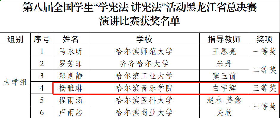 近日,第八届全省学生“学宪法 讲宪法”活动获奖名单公示,学院荣获“最佳组织奖”,音乐学系党总支本科生杨雅琳(指导教师:白宇辉)荣获主题演讲比赛高校组三等奖。