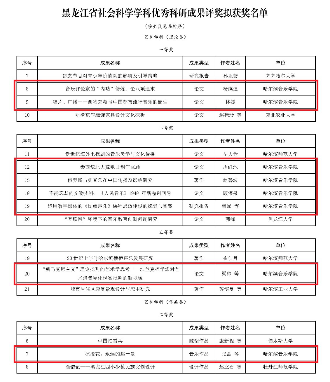 近日,黑龙江省社会科学界联合会公布了2023年度黑龙江省社会科学学科优秀科研成果评奖拟获奖名单。学院共获奖8项。其中,艺术学科(理论类)一等奖2项,二等奖4项,三等奖1项,艺术学科(作品类)二等奖1项。音乐艺术领域优秀科研成果数量在本次获得艺术学科(理论类)奖项的学校中位居首位。