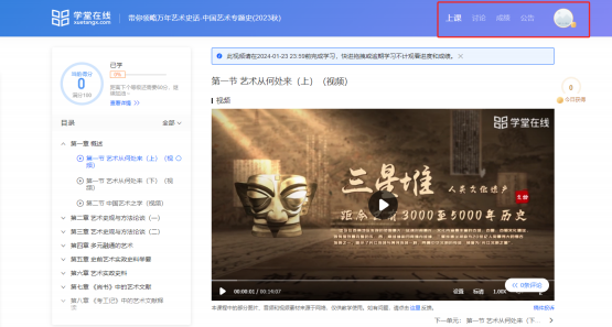 4.课程分为三部分:上课、讨论和成绩。点击上课可以观看课程视频,完成课后习题等:点击讨论可以讨论、发帖等:在成绩这一部分可以看到总成绩以及成绩明细等。